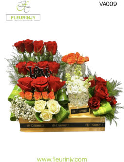 Original price was: 4,350 EGP.3,480 EGPCurrent price is: 3,480 EGP.A wooden pallet arrangement featuring red and white roses, stock, spray roses, and fresh greens. Size: 45×40.