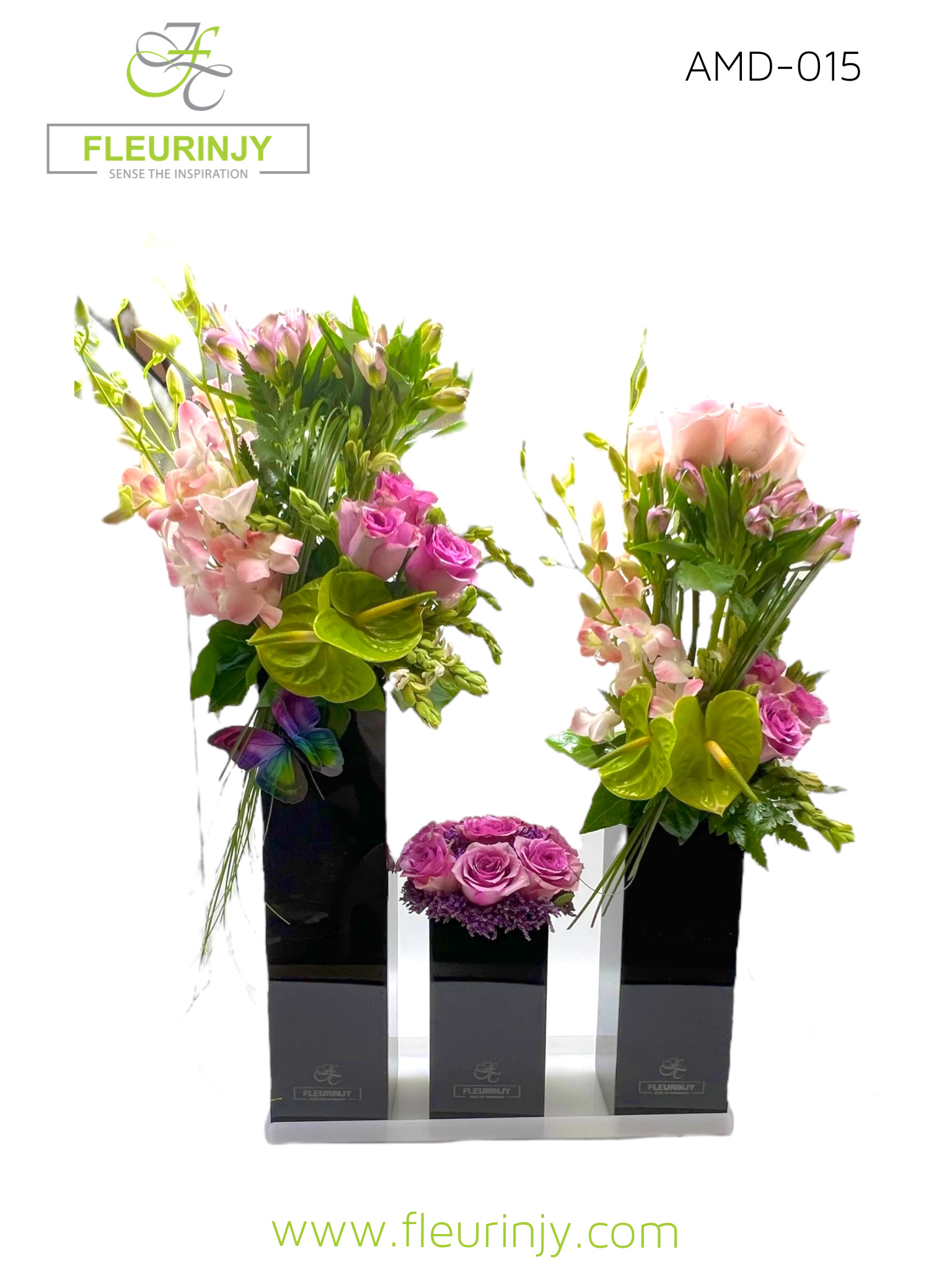 OUR SIGNATURE COMBO ACRYLIC 3 SET OF VASES WITH A TRAY 19 ROSES 6 ALESTROMERIA 8 BABY ORCHIDS GREENS