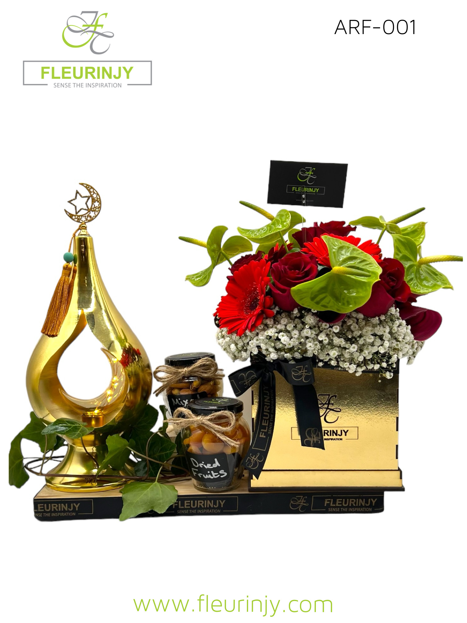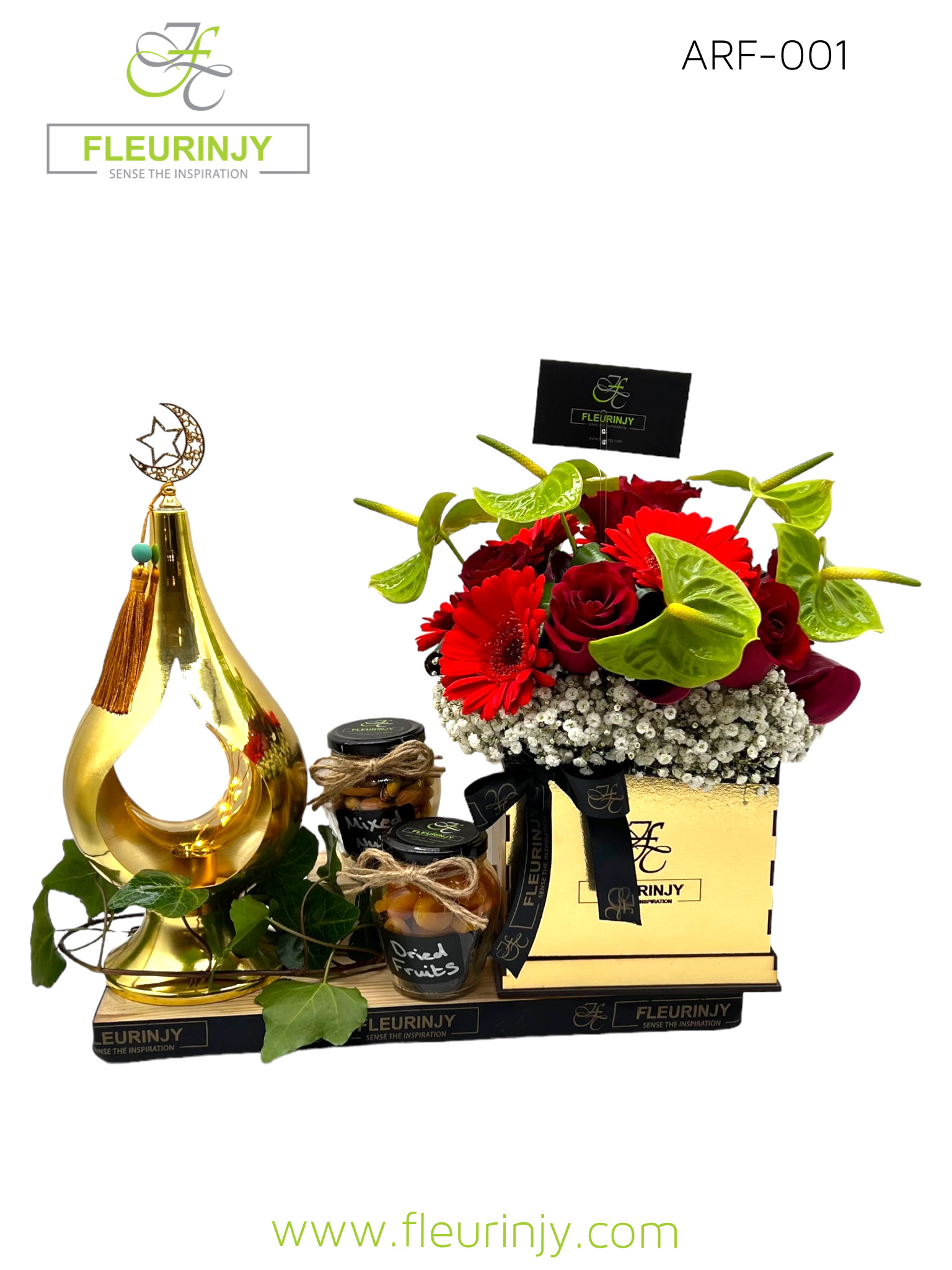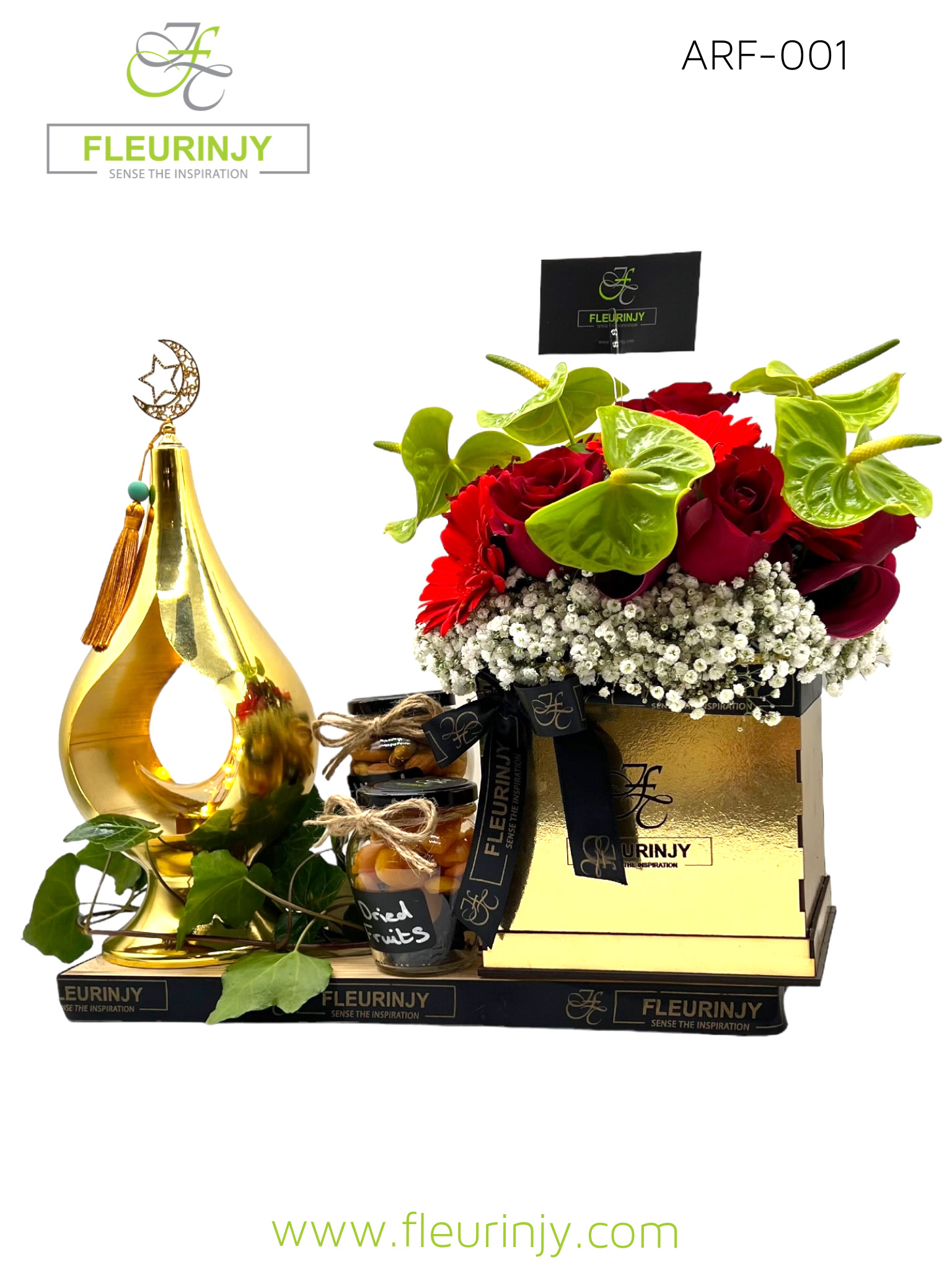 1 Stainless steel fanous 1 jar dried fruits 200 grms 1 jar mixed nuts 150 grms 6 Anthurium  5 Roses 6 Gerbera Size: 40 x 40