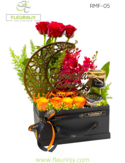 Flat Box: 1 Tamreya made of opaque stainless steel 3 Roses 2 Anthurium 3 Gerbera Inside the Tamreya: Quarter kilo of Premium Mejdool Dates From Timar, Stuffed with: -Caramalized Almonds – Pistachio oriental flavor – walnut Caramel – Halawamania – Hazelnut Croquant Chocolate Dates