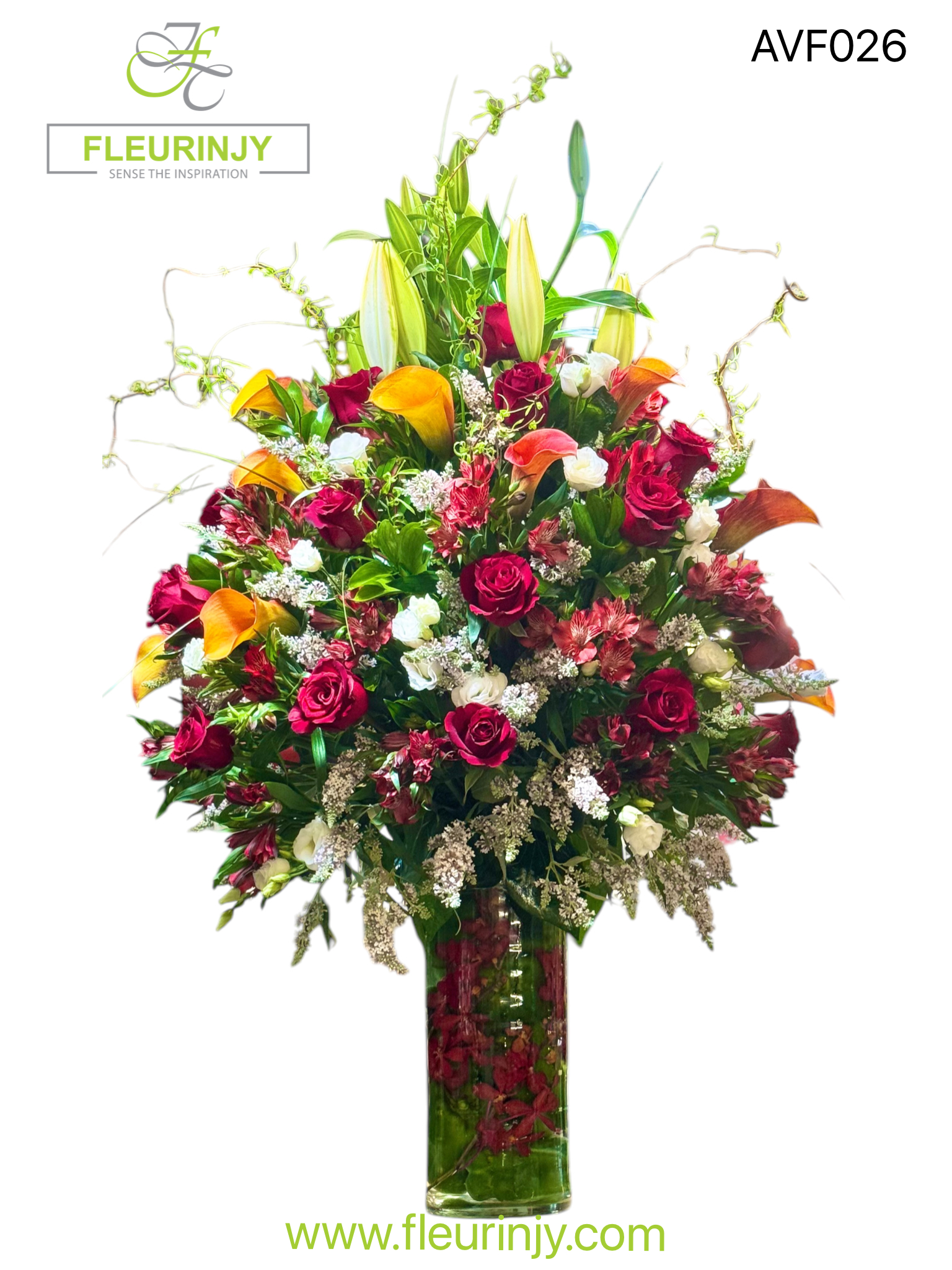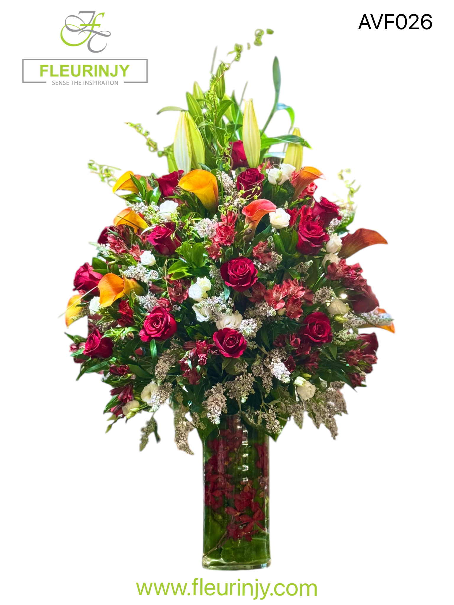 THE MAGNUM PEPPER FLOWER MIX INCLUDING: CYLINDER VASE INSIDE IT GREEN BELL PEPPERS WITH RED ORCHIDS ALONG ON THE TOP A MIXTURE OF LUXURIOUS FLOWERS ROSES ORCHIDS CALLA ALSTROEMERIA STOMA FILLERS AND GREENS