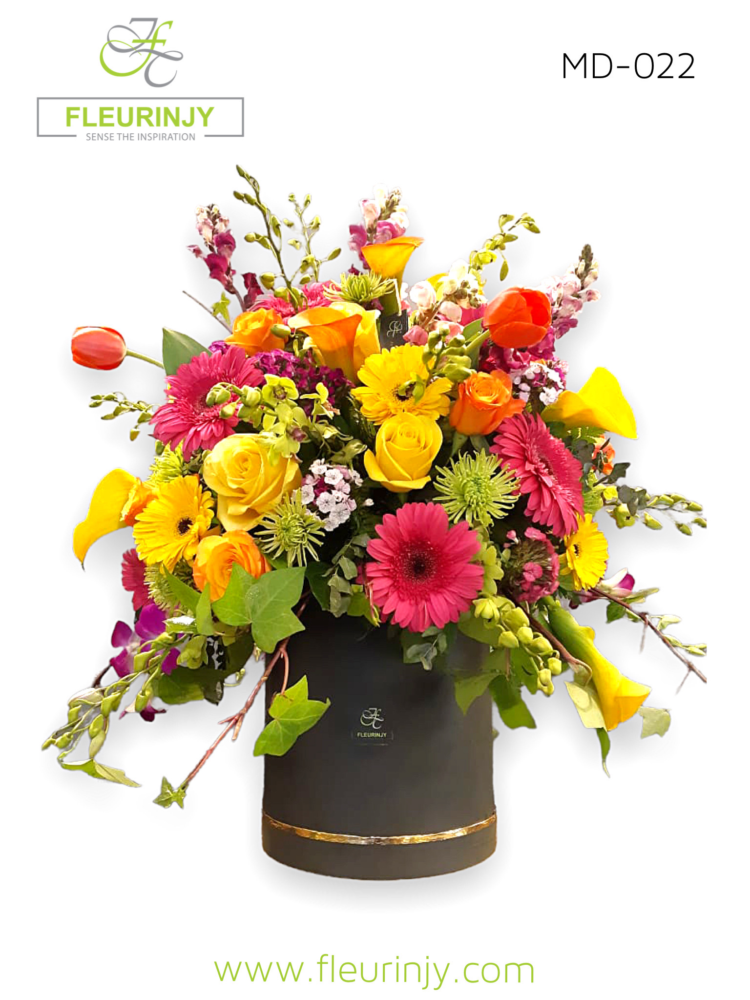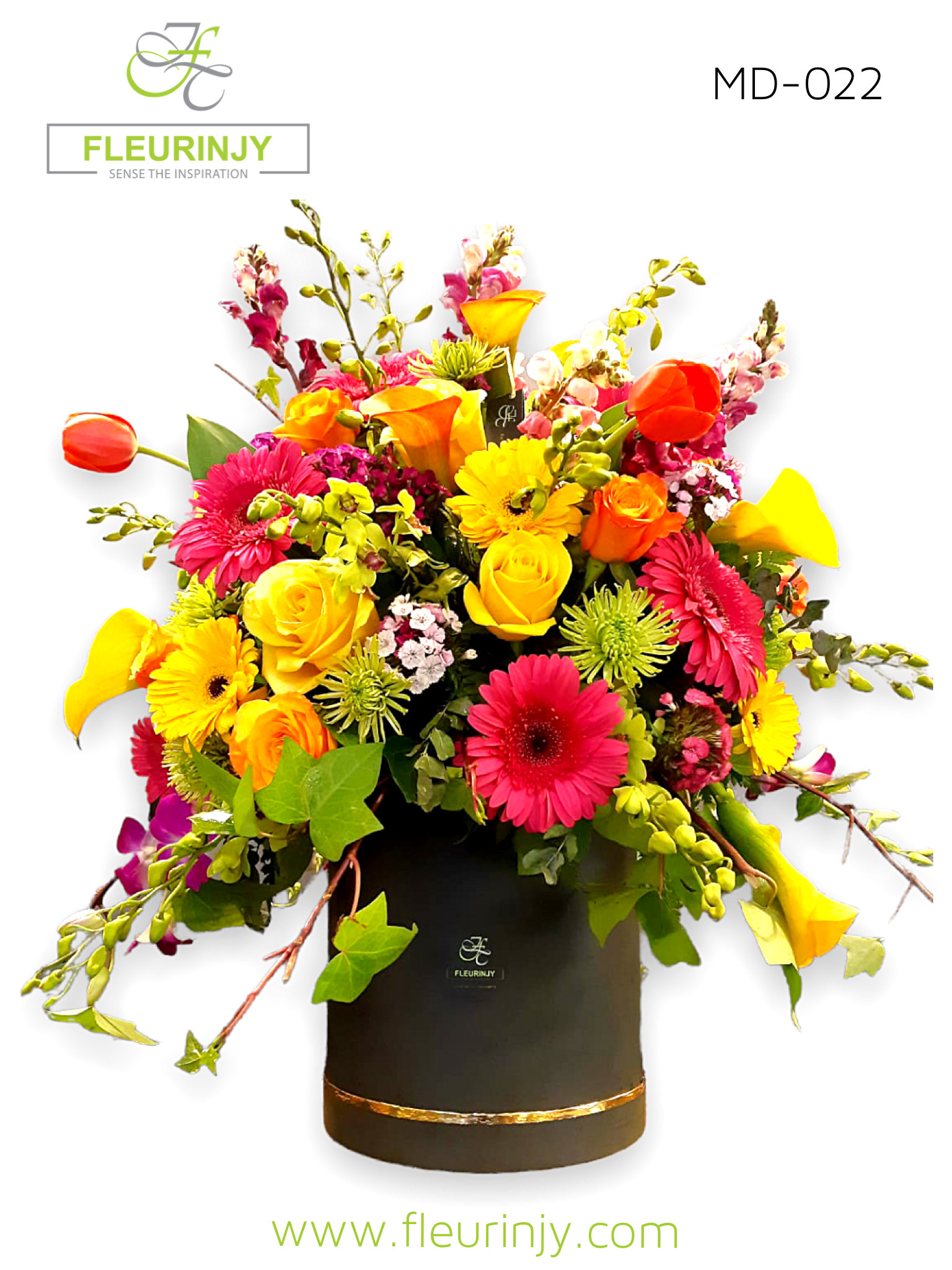 Black cylinder box inside it : 12 yellow roses 12 orange roses. 7 snapdragon. 5 yellow calla. 5 orange calla. 10 fushia gerbera. 10 yellow gerbera. 12 baby orchids. 20 shamrock. Size : 60 x 70 cm