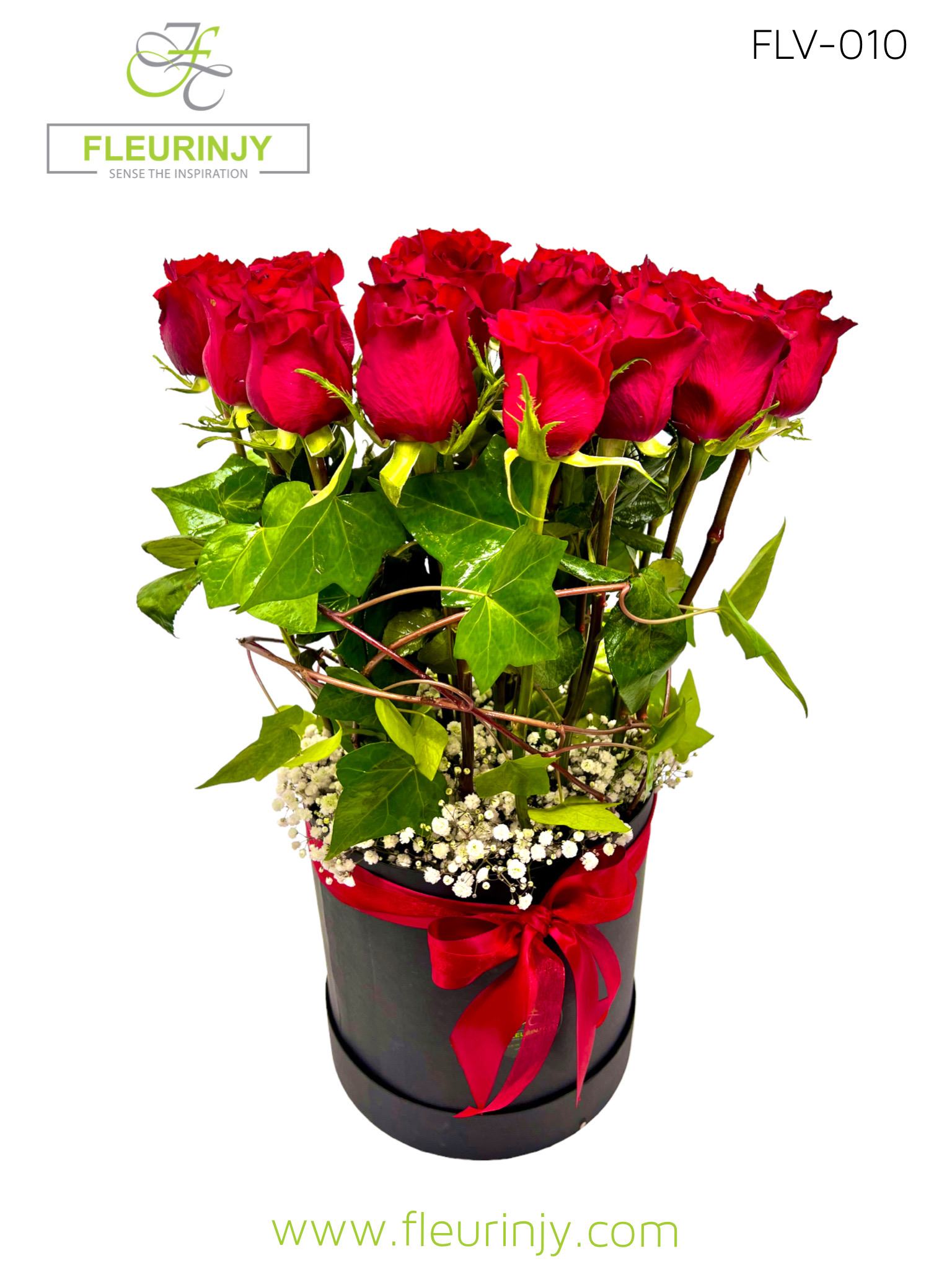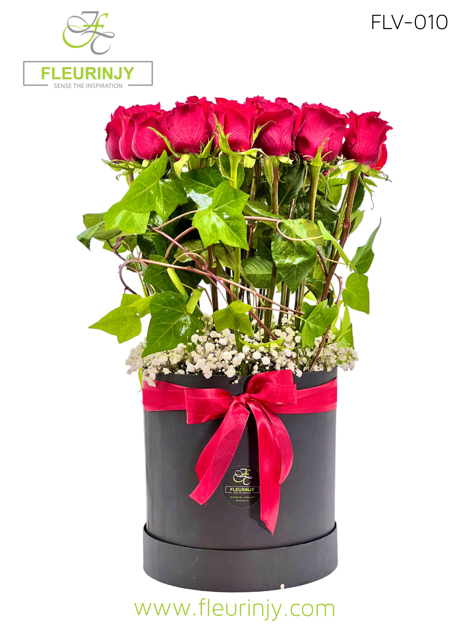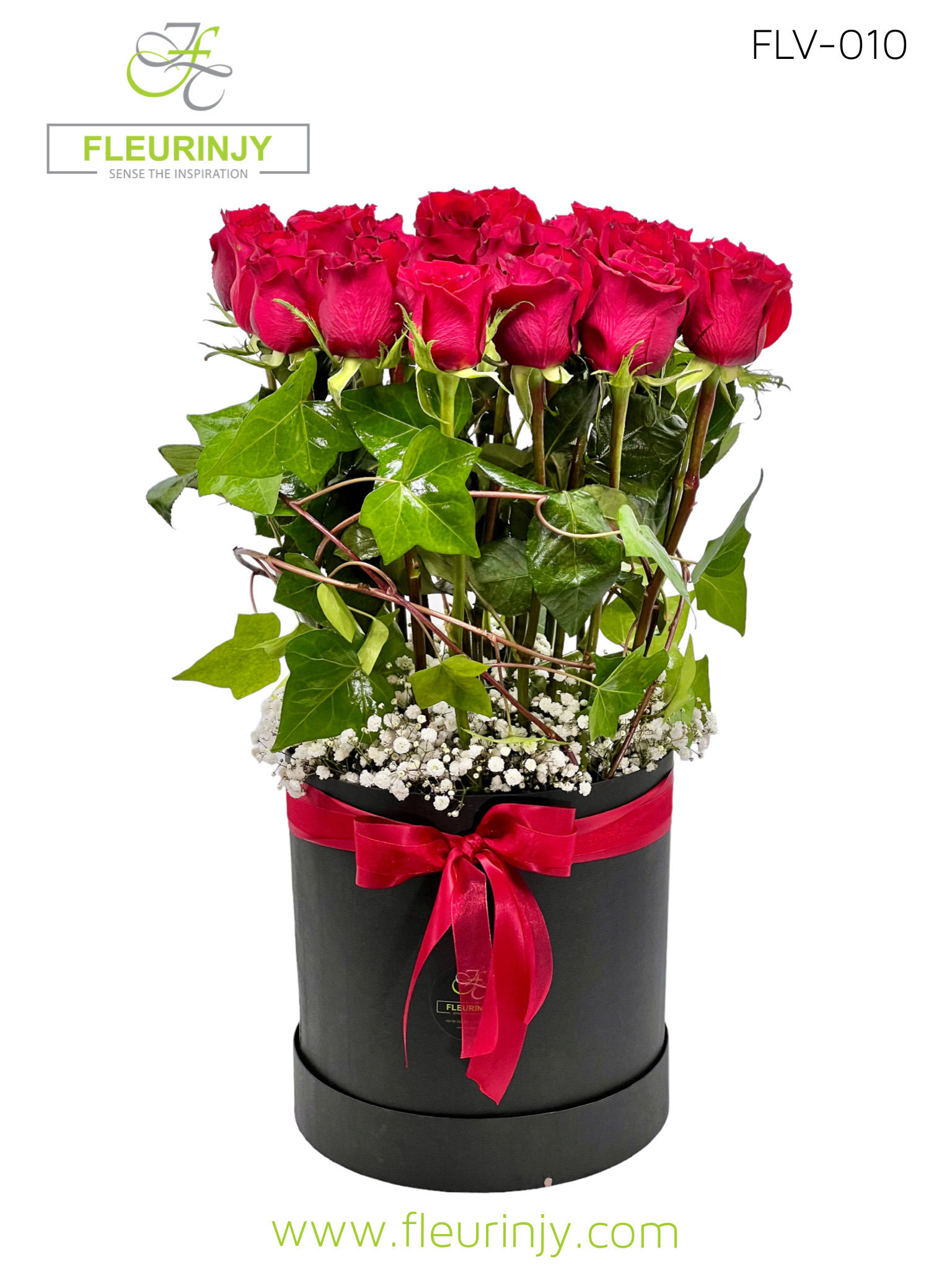 Cylinder black box inside it: 20 red roses baby breath greens Size: 70 x 25 cm