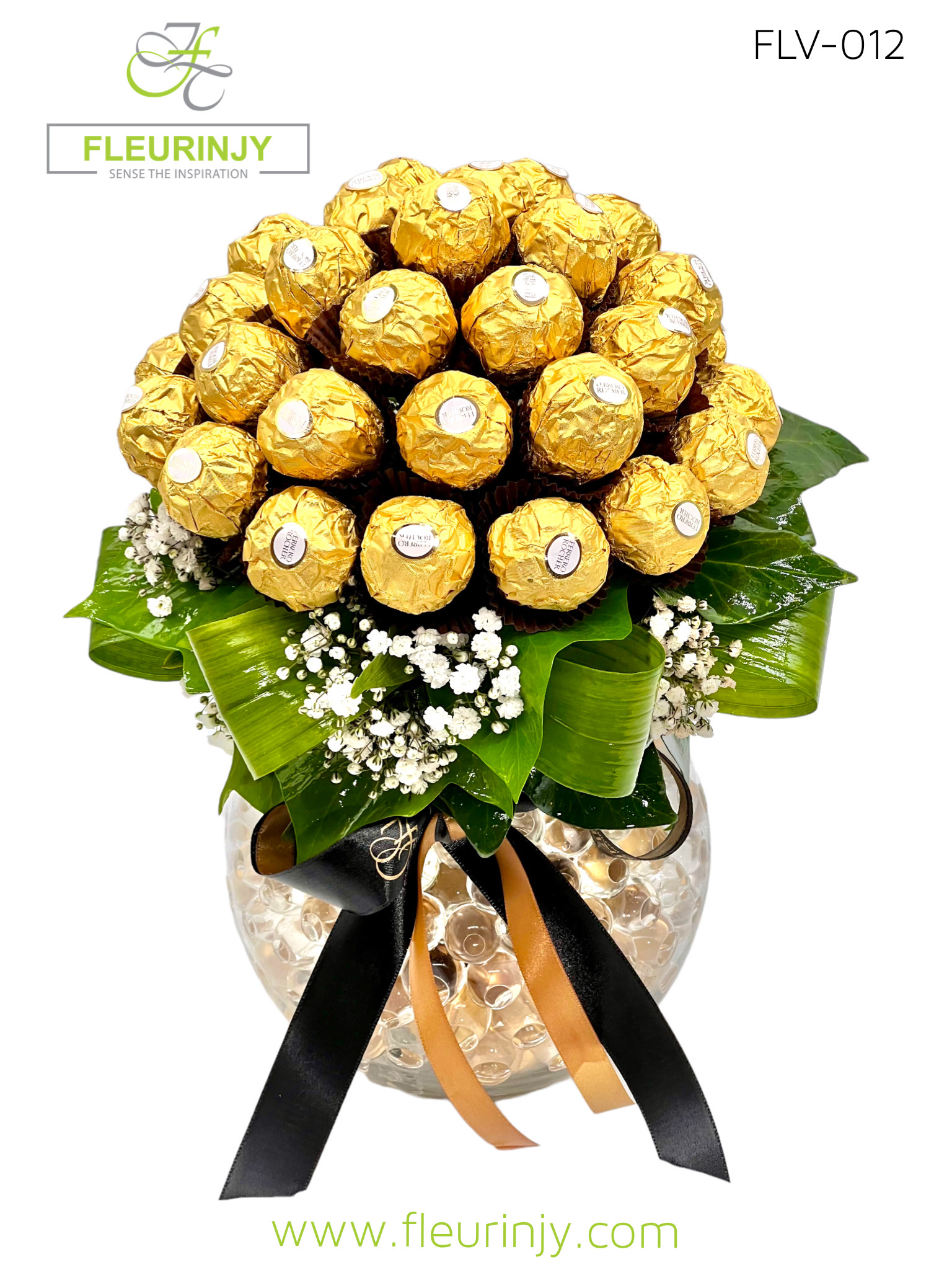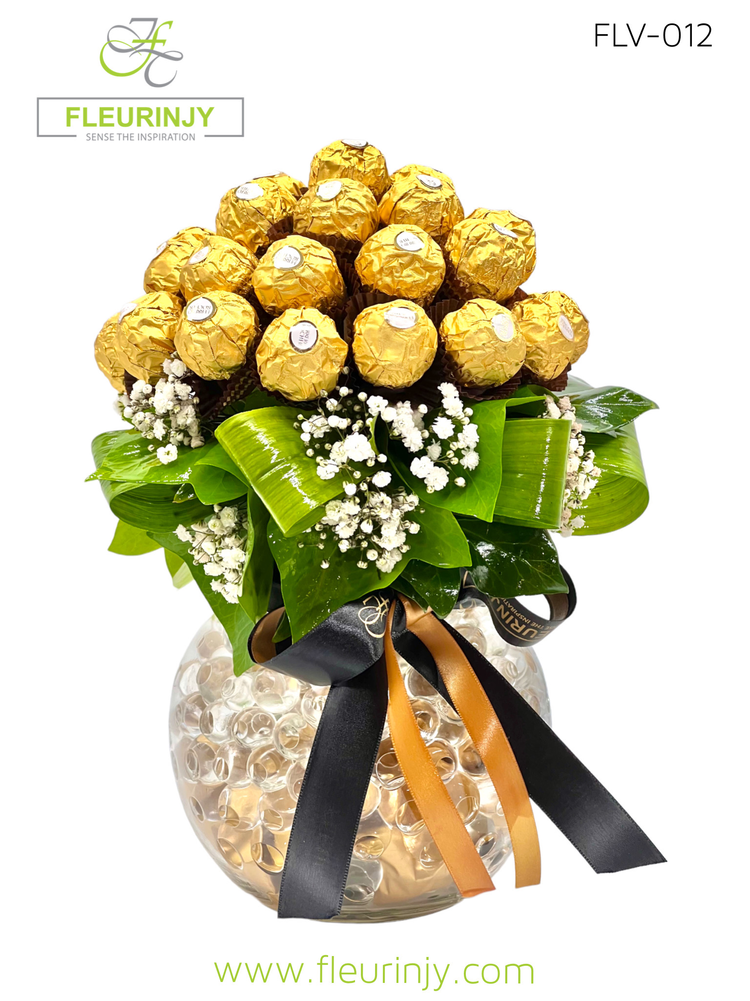 Chocolate bouquet in a fish bowl inside it : 22 rocher chocolates baby breath greens Size: 20 cm