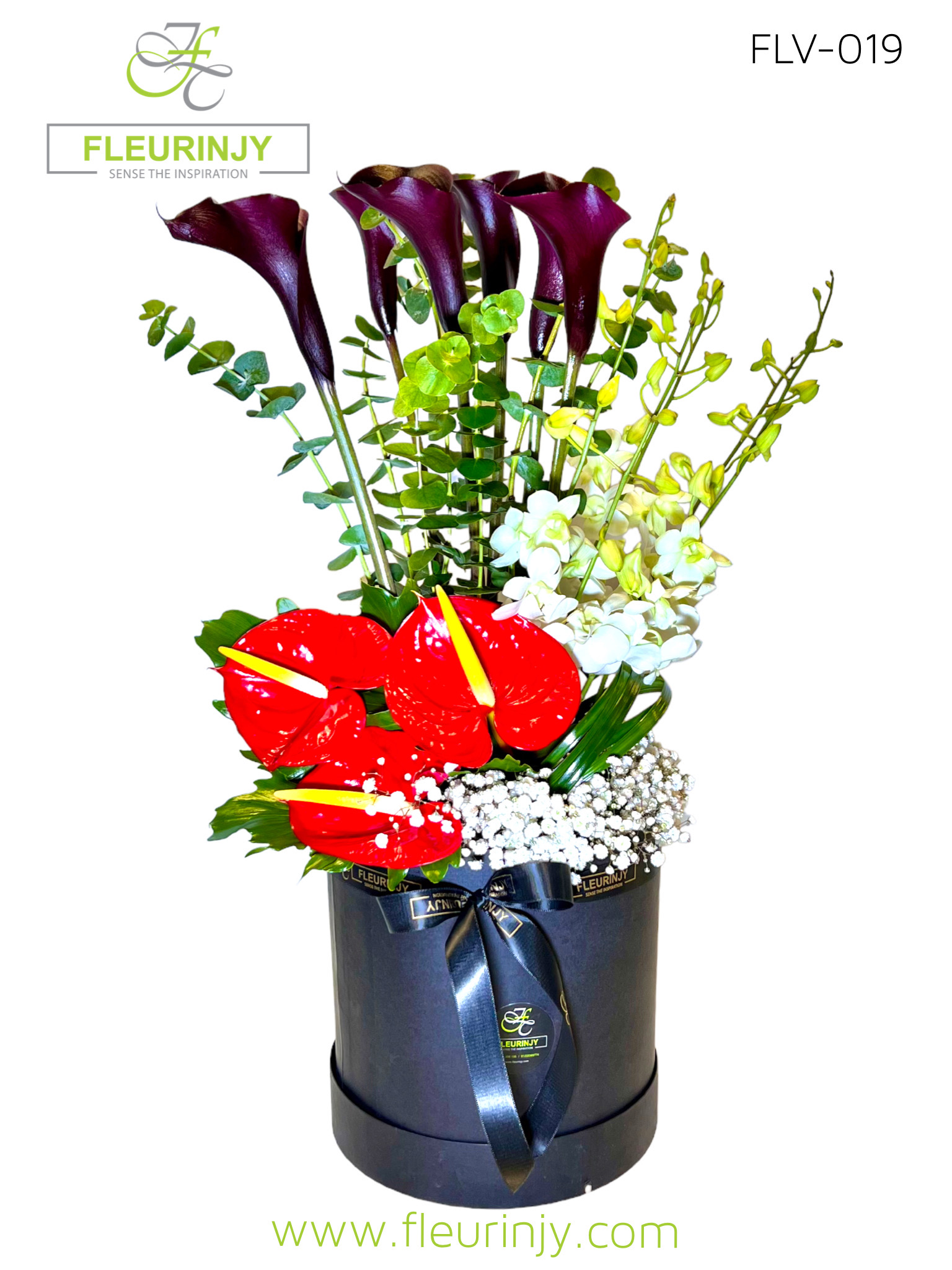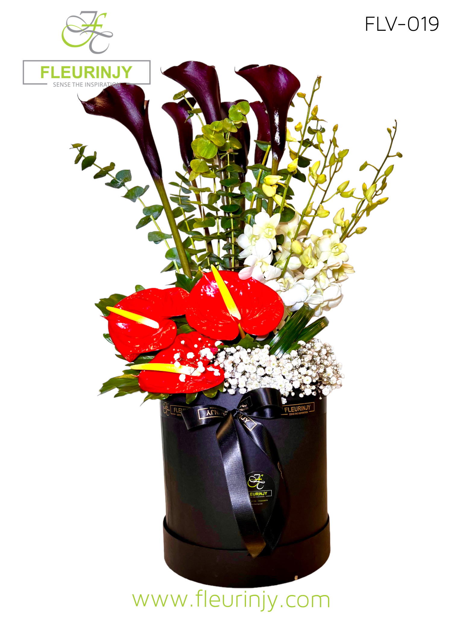 Cylinder black box inside it: 6 black callas 5 white baby orchids 3 red anthuriums baby breath and greens Size: 70 x 25 cm