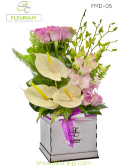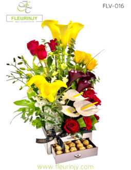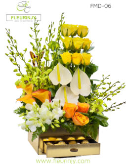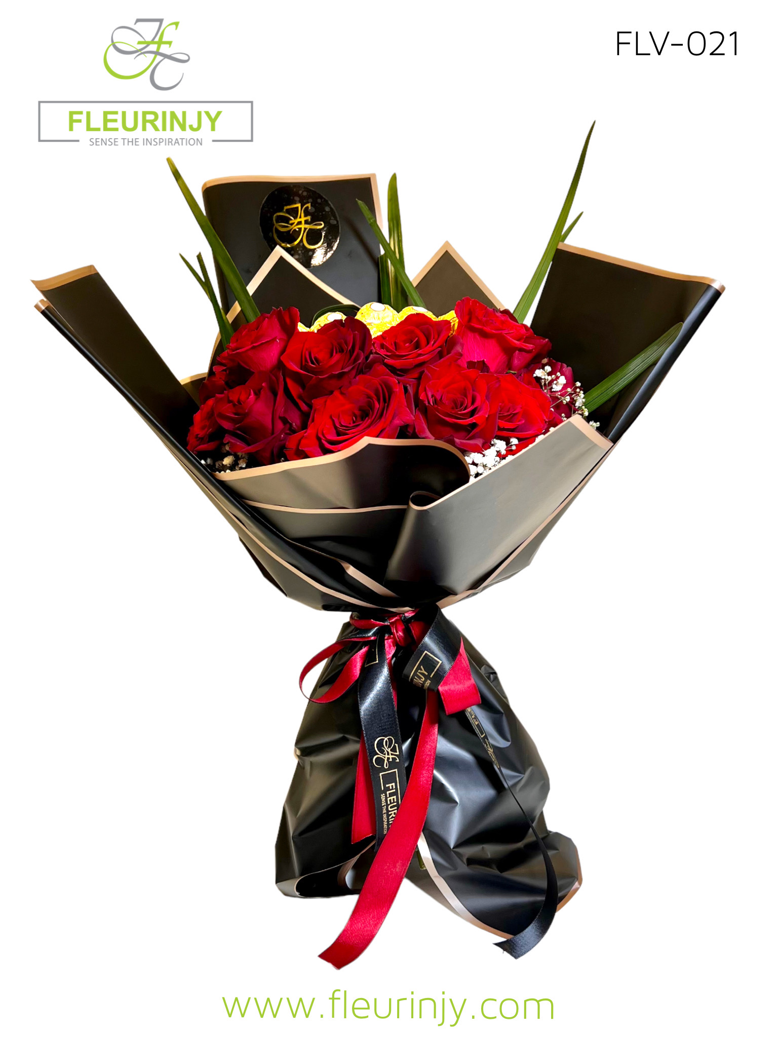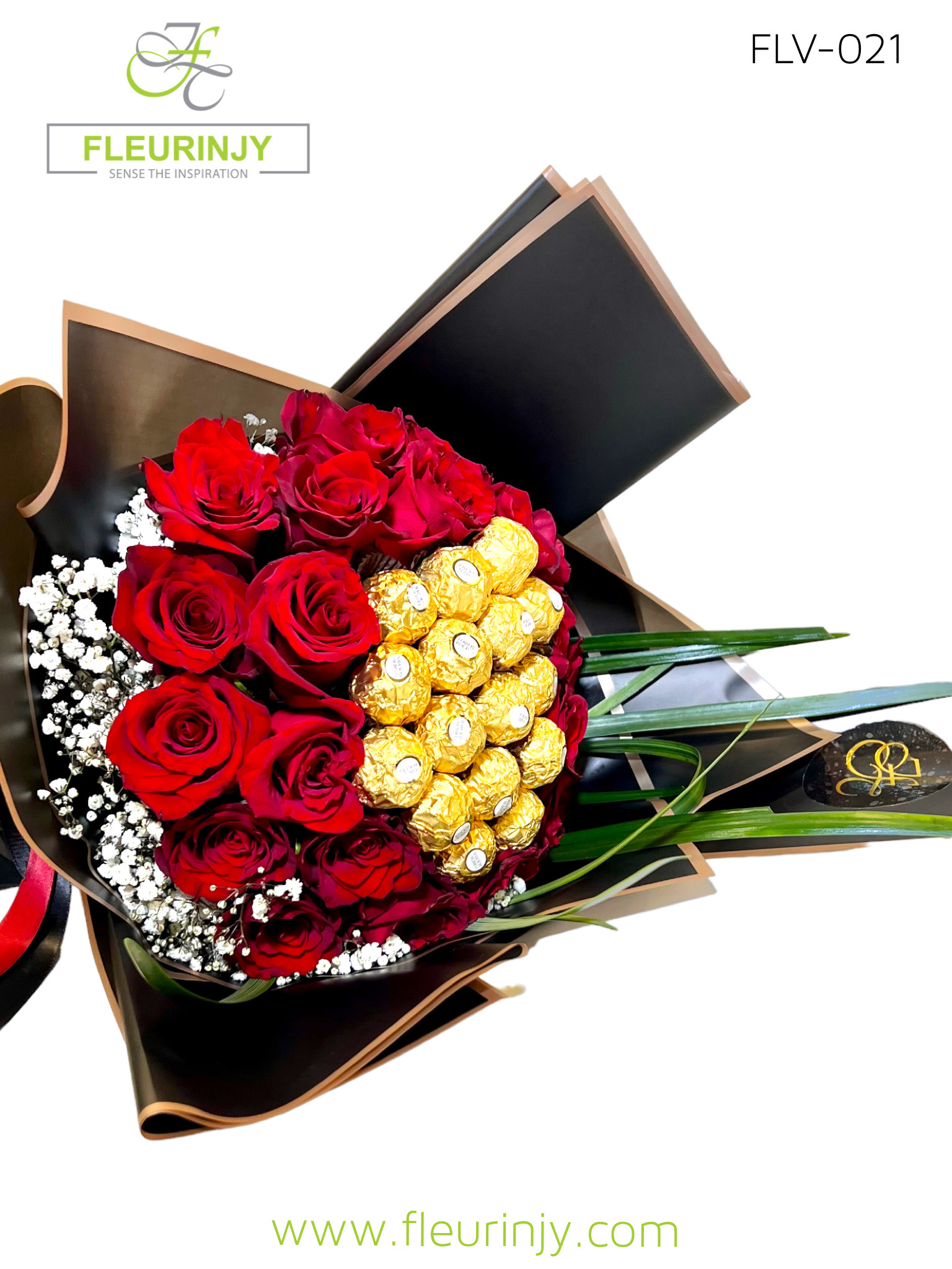 Hand Bouquet: 20 red roses 16 rocher baby breath Size: 60 cm Wrapped in our Exclusive black and gold paper