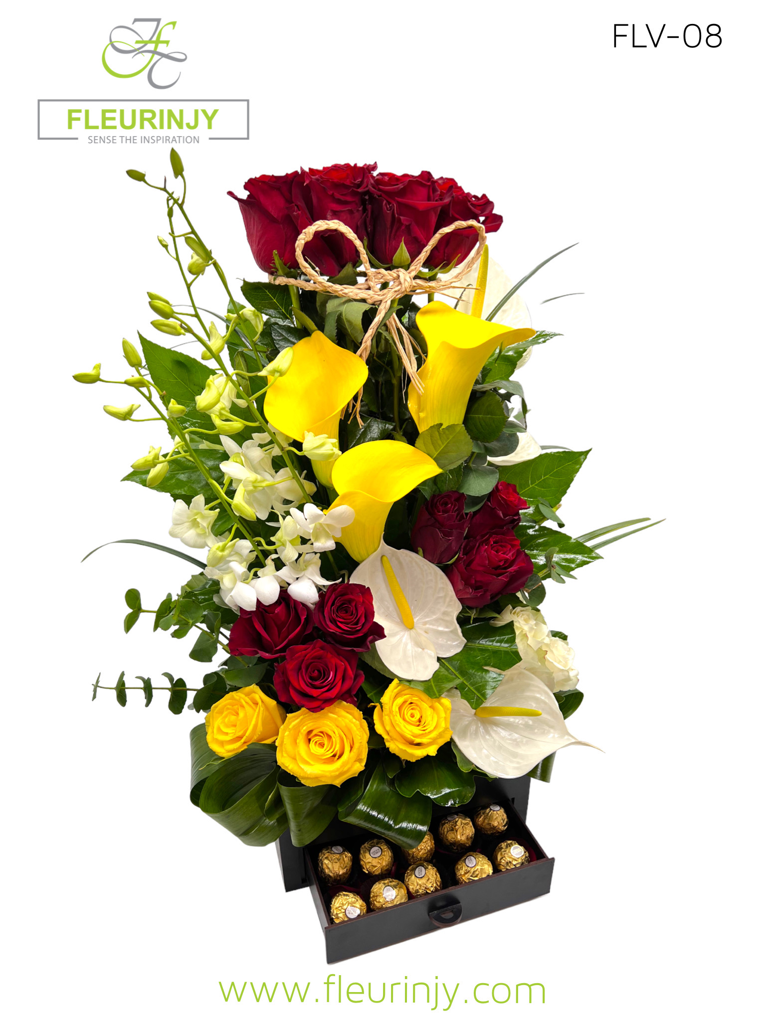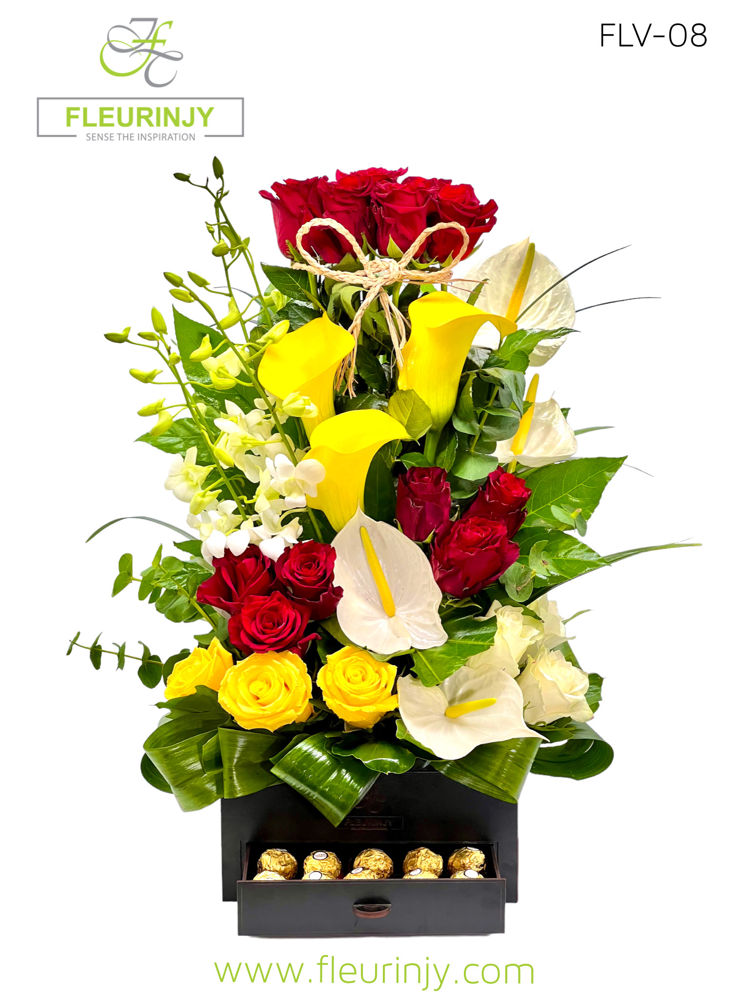 Our Signature drawer box inside it : Ingredients : 11 red roses, 3 white roses, 3 yellow roses, 4 white anthuriums, 3 yellow calla, 4 baby orchids & greens size: 25 x 60 cm Chocolate : 16 rocher
