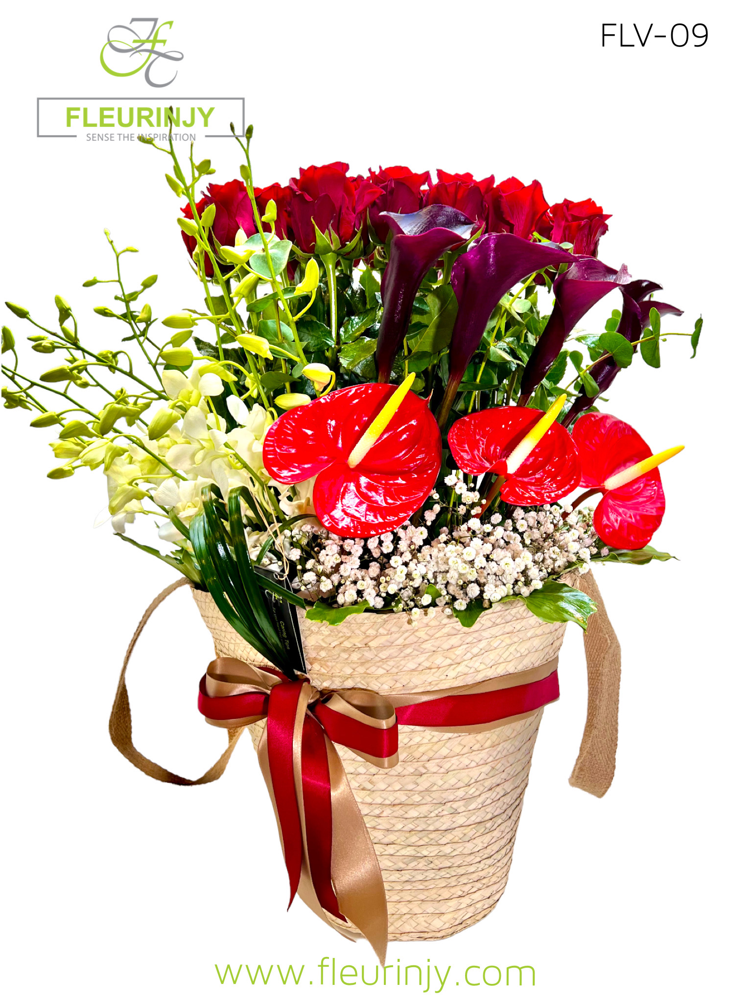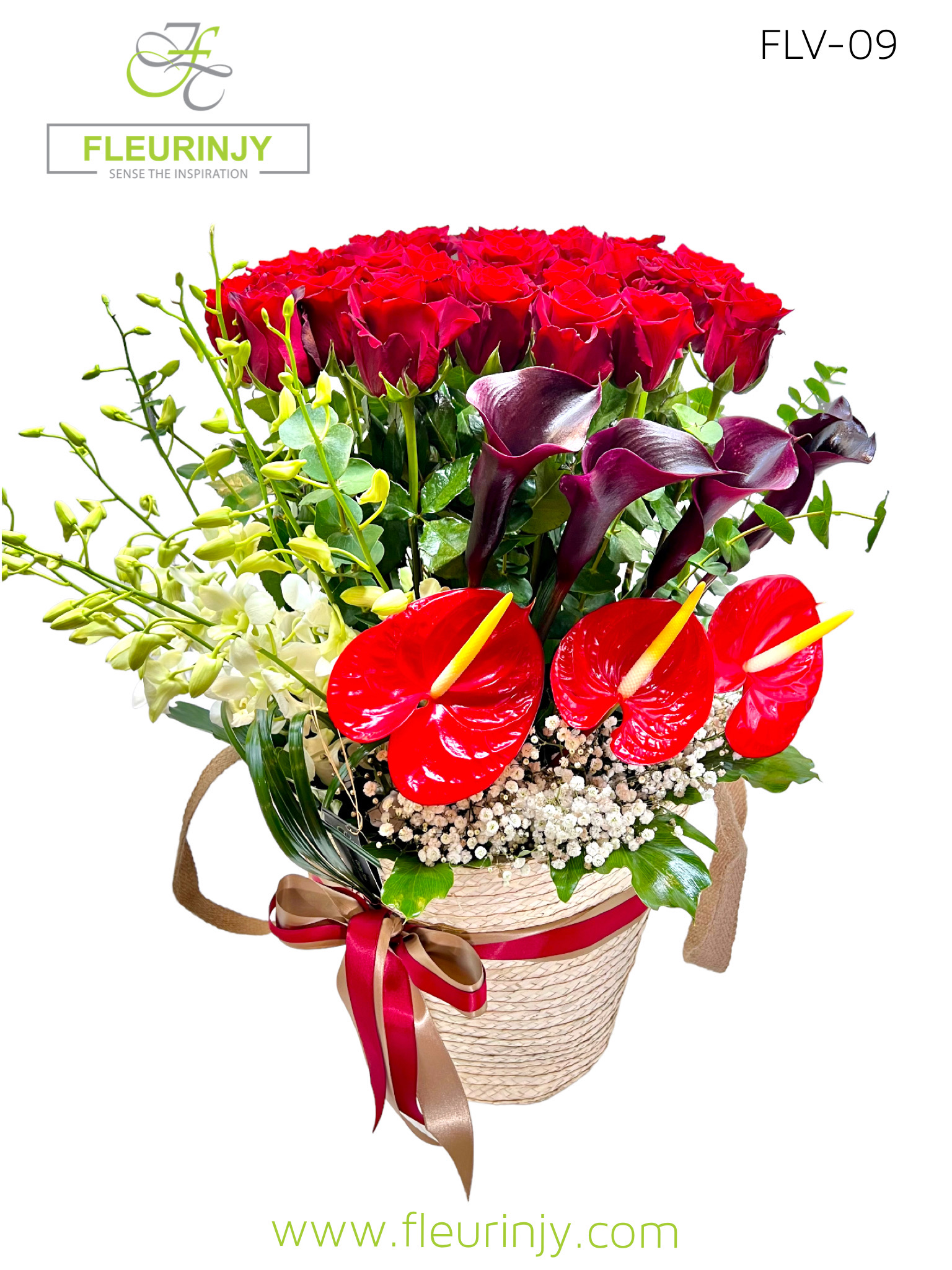 KHOOSE BAG suitable to use later for the beach inside it: 25 red roses 4 black calla 3 red anthuriums 8 white baby orchid greens Size: 70 x 40 cm