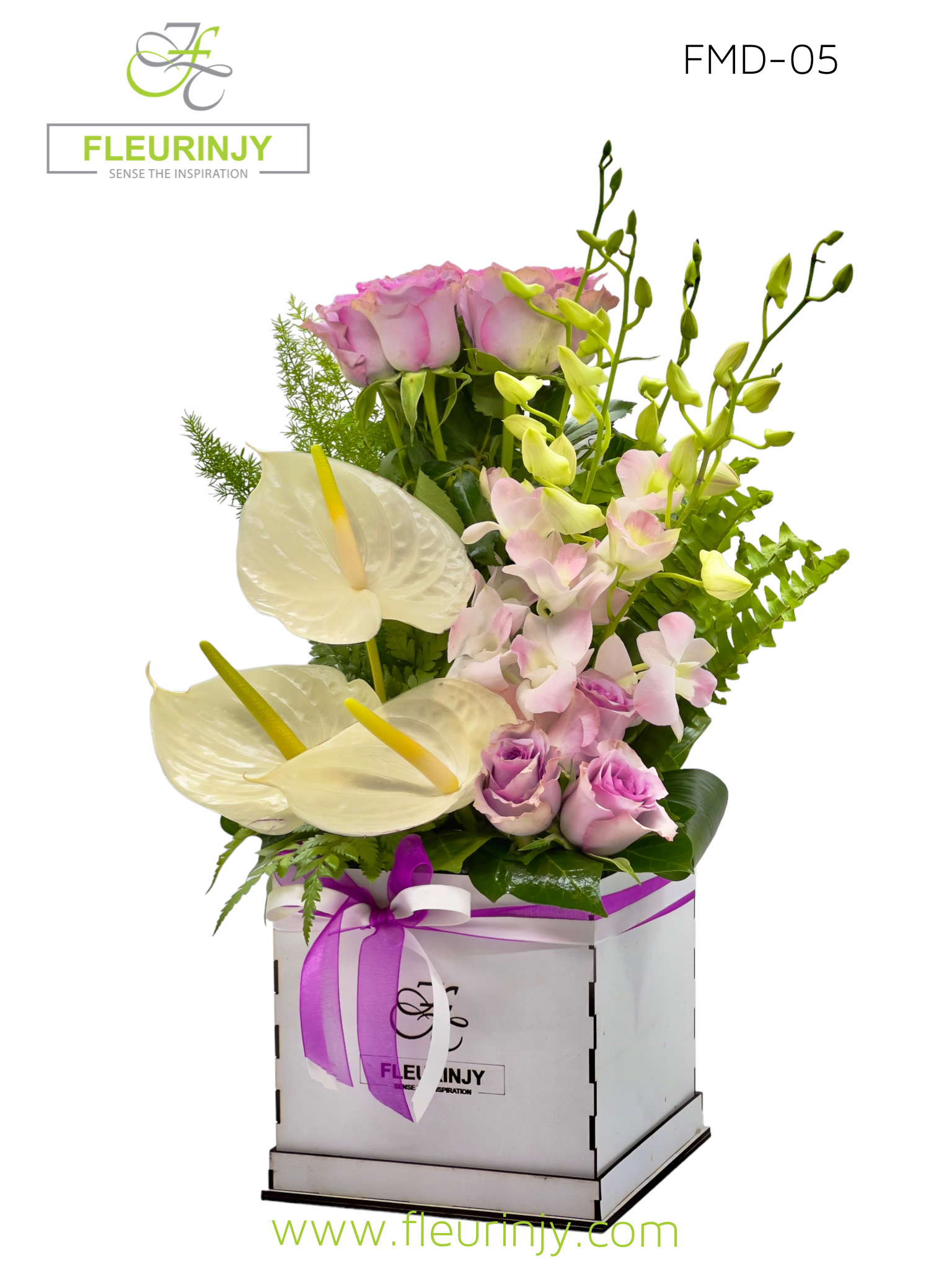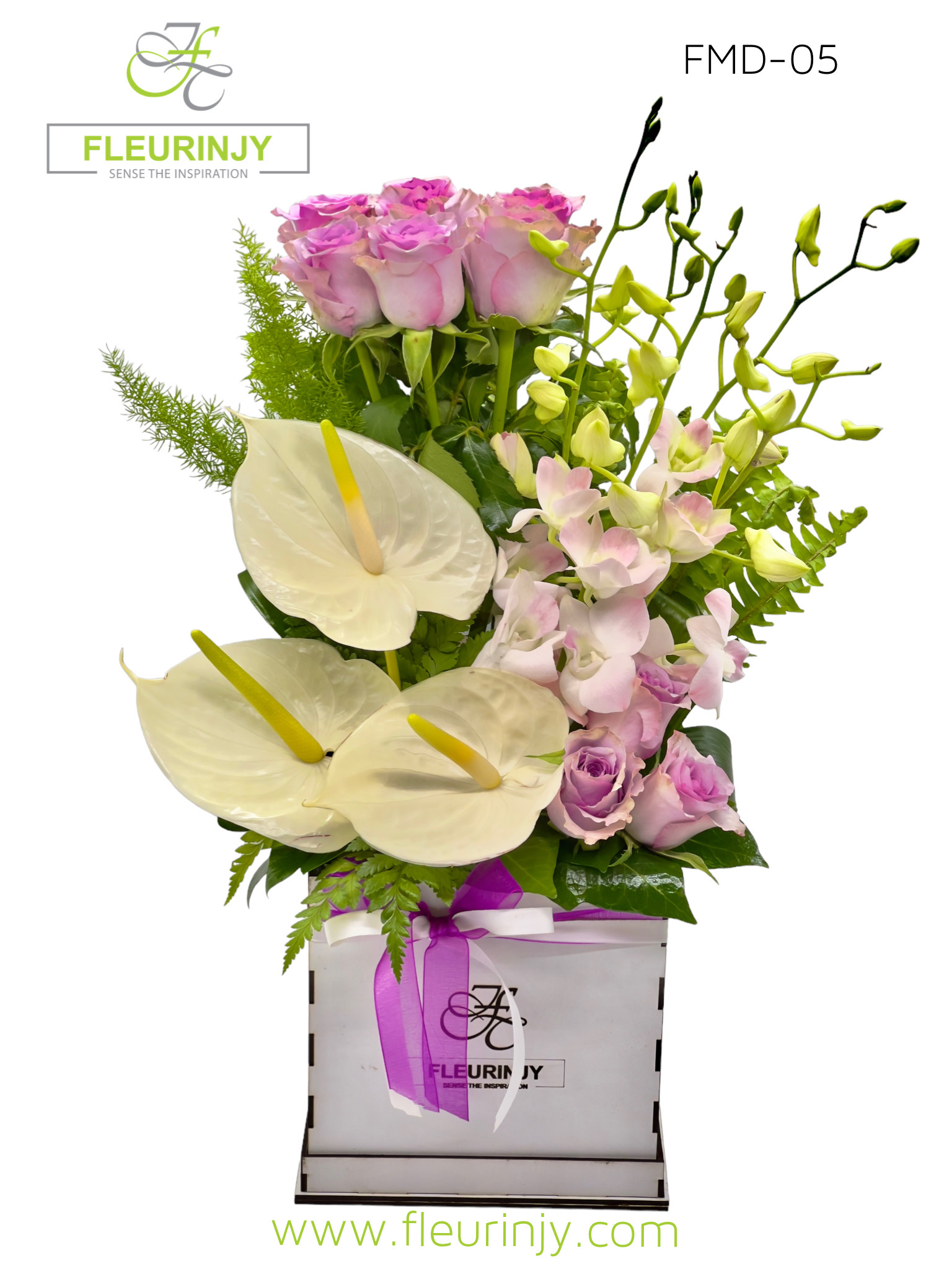 OUR SQUARE SIGNATURE BOX: 10 PINK ROSES 3 WHITE ANTHURIUMS 5 WHITE BABY ORCHIDS SIZE: 20 X 40 CM