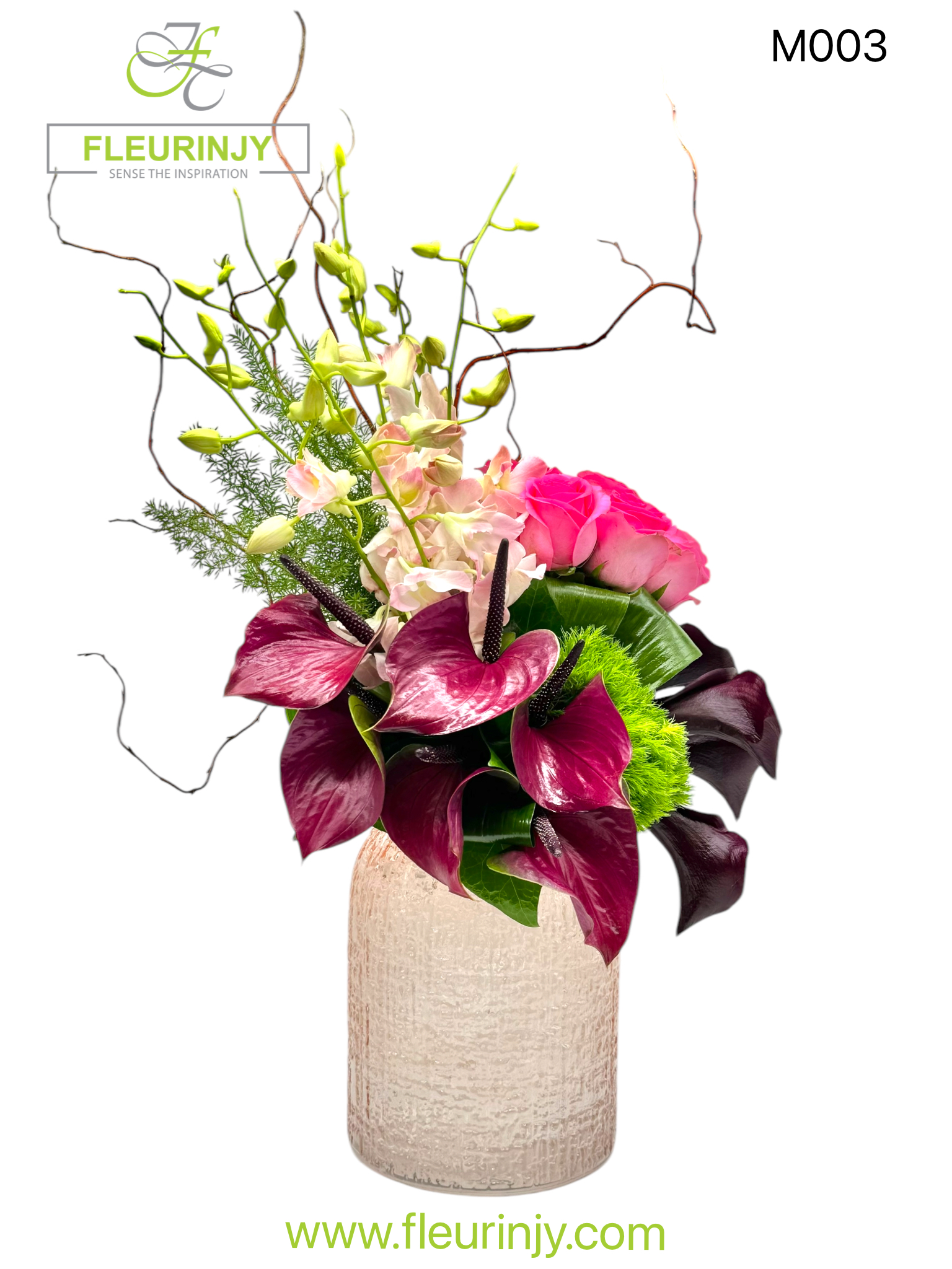 VASE ARRANGEMENT : 6 BABY ORCHIDS 6 ROSES 4 CALLAS 4 SWEET WILLIAM 6 ANTHURIUM 2 SALIX CURLS GREENS SIZE: 60 X 30 CM