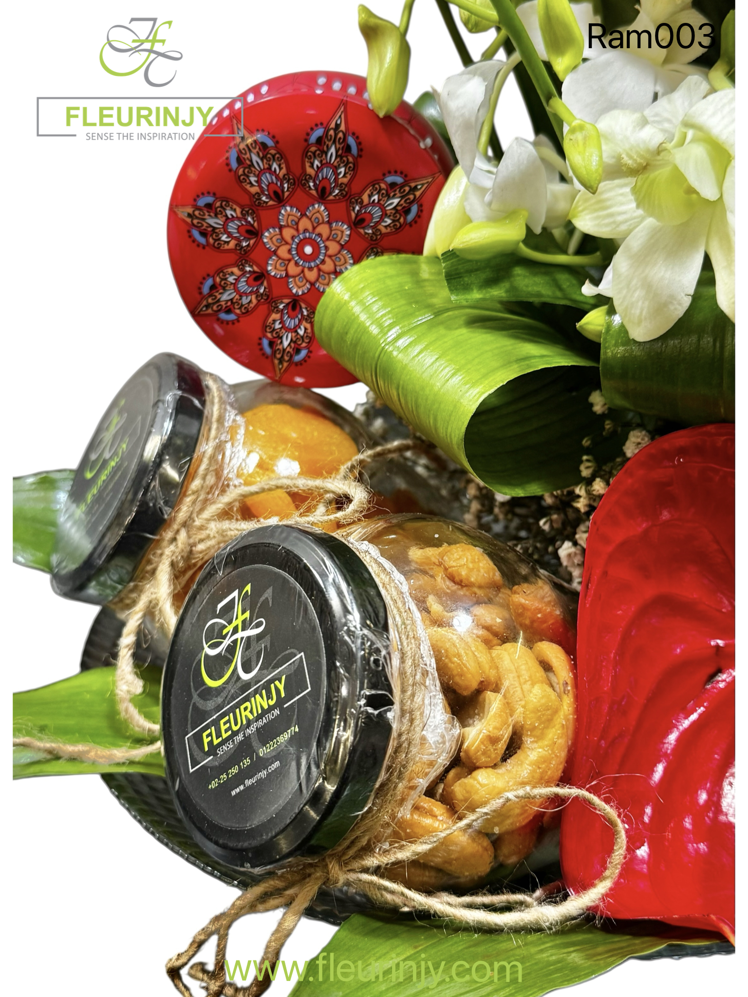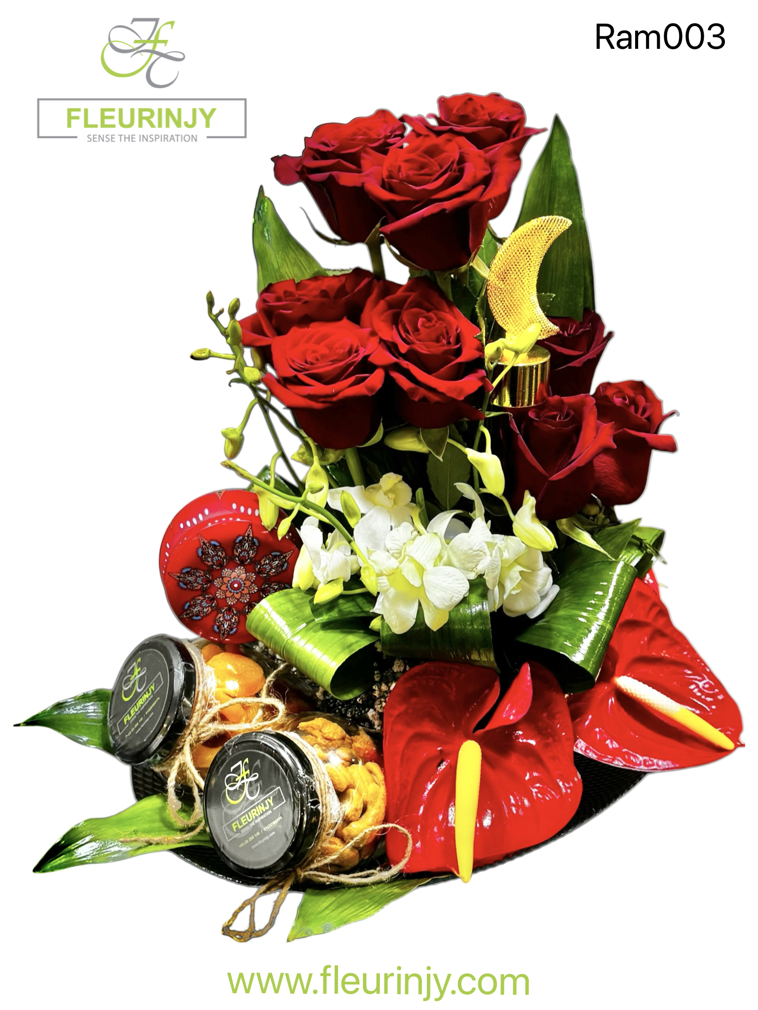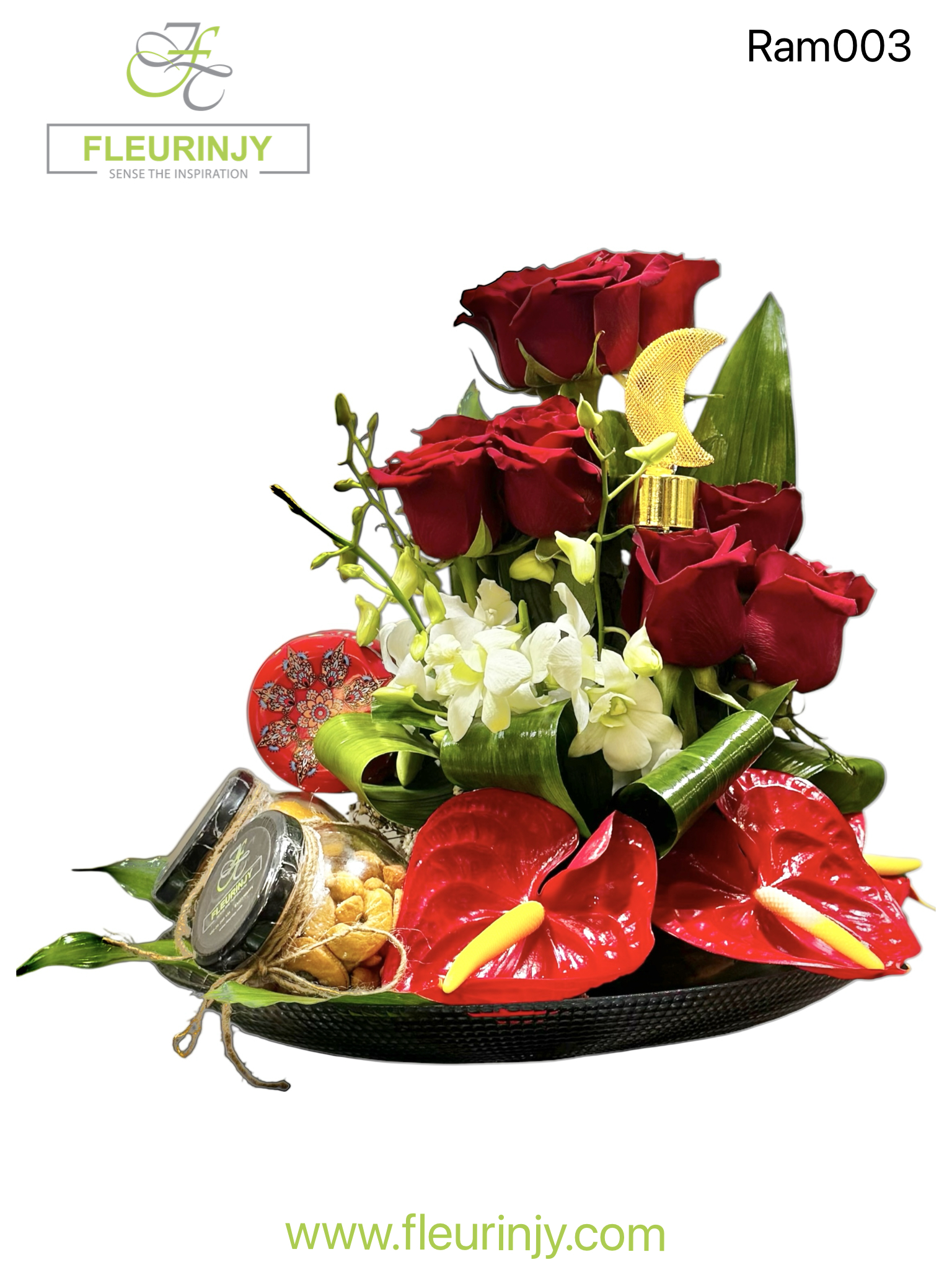 OVAL TURKISH PLATE INCLUDING 9 RED ROSES, 3 RED ANTHURIUMS, 4 WHITE BABY ORCHIDS AND 2 JARS OF HAMEES’S RAMADAN ASSORTMENT