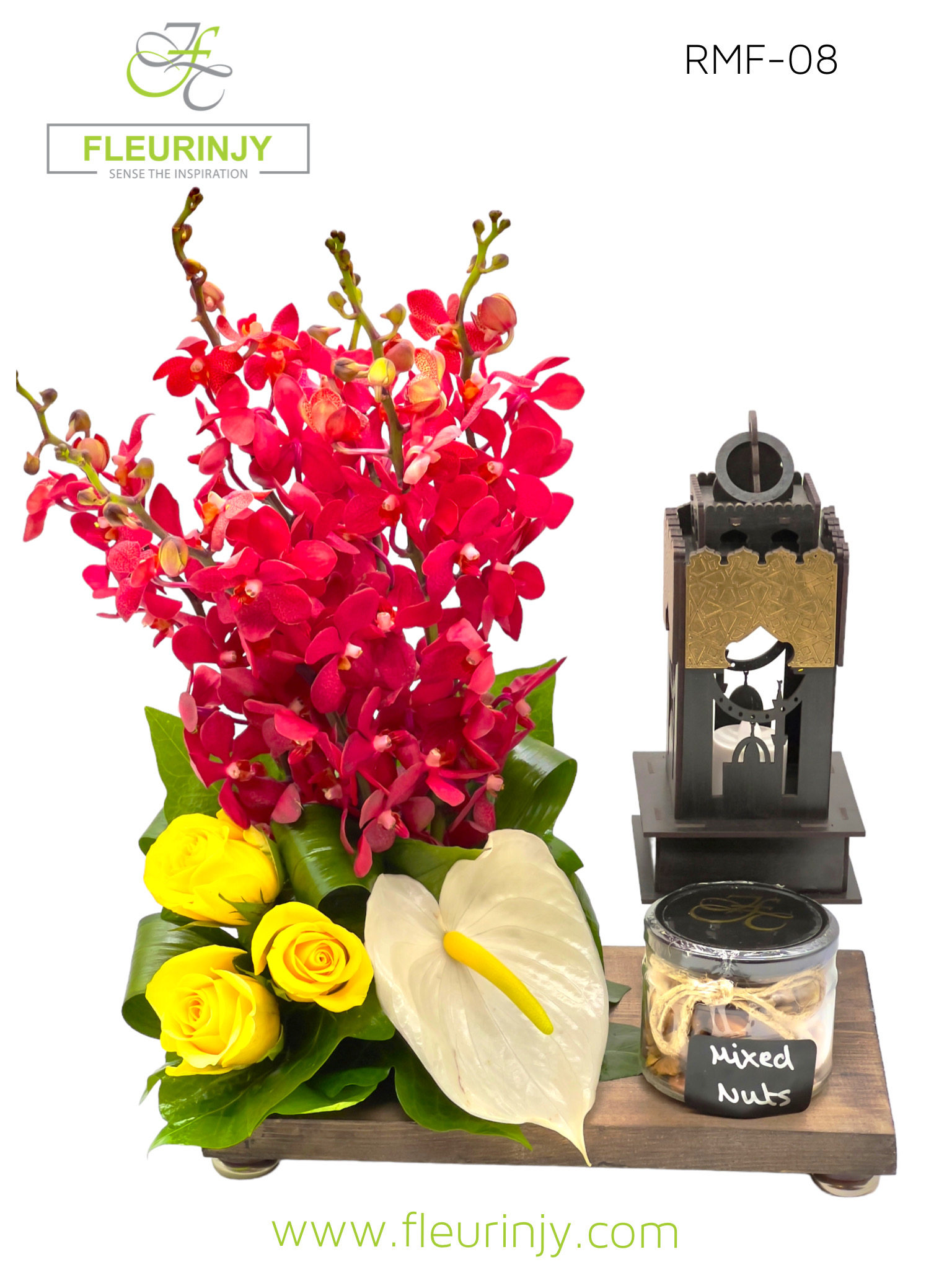 Wooden pallet 6 red orchids 3 yellow roses 1 white anthurium 1 mixed nuts jar 1 wooden lantern SIZE : 30 X 30 CM
