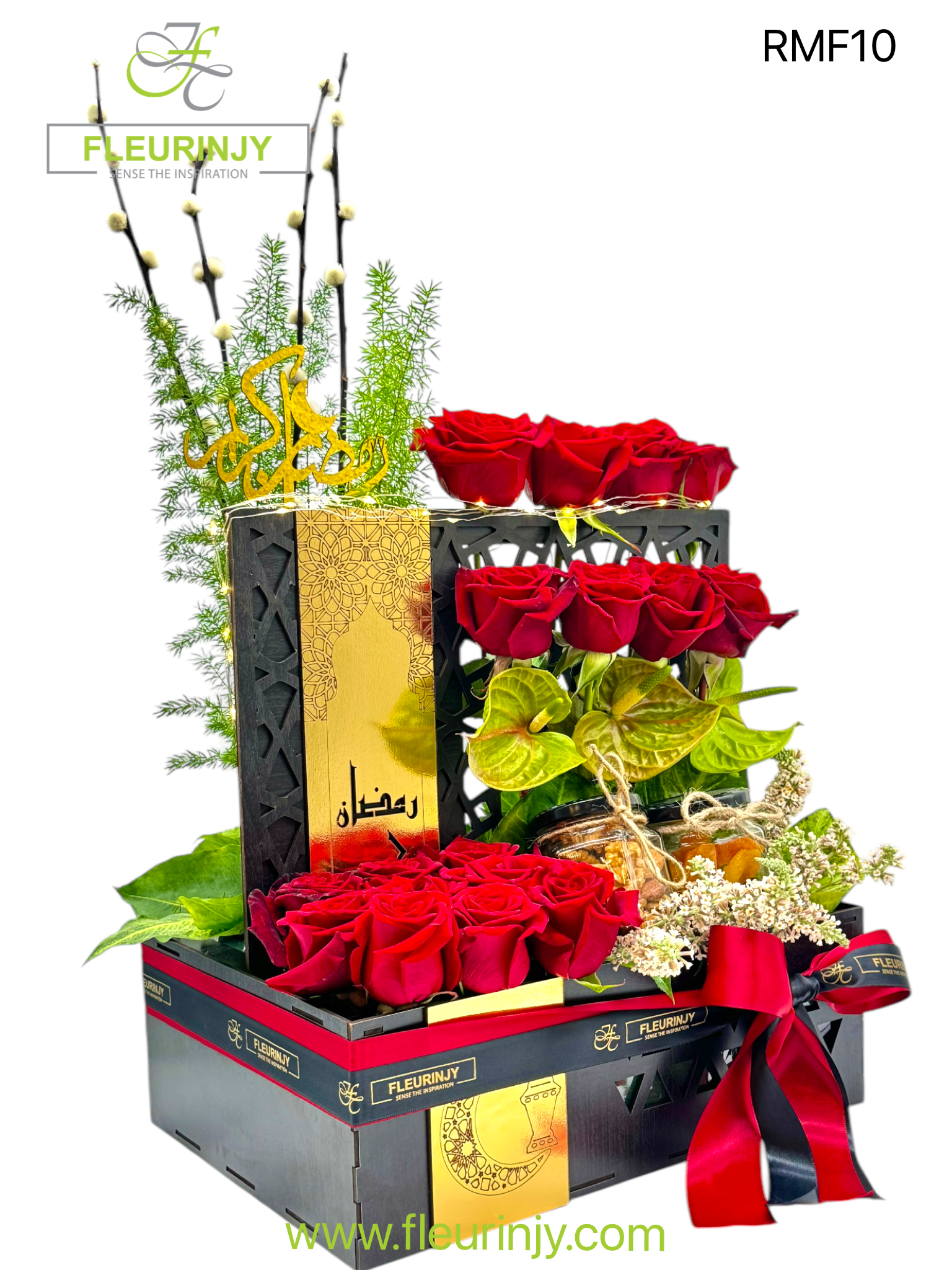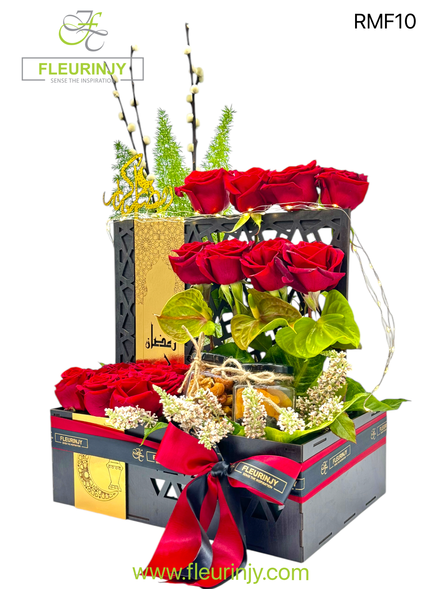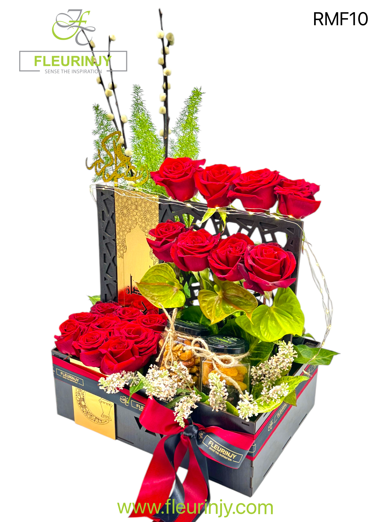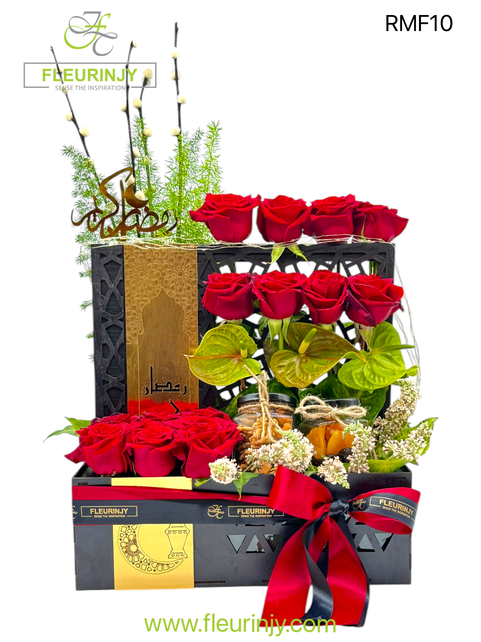 RAMADAN WOOEN BOX INCLUDING 17 ROSES 3 ANTHURIUM SALIX COTTON GREENS 1 JARS OF MIXED NUTS 100 GRMS 1 JAR OF DRIED FRUITS 150 GRMS