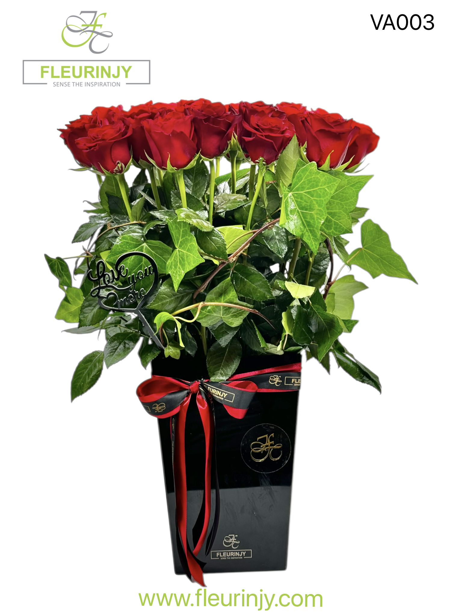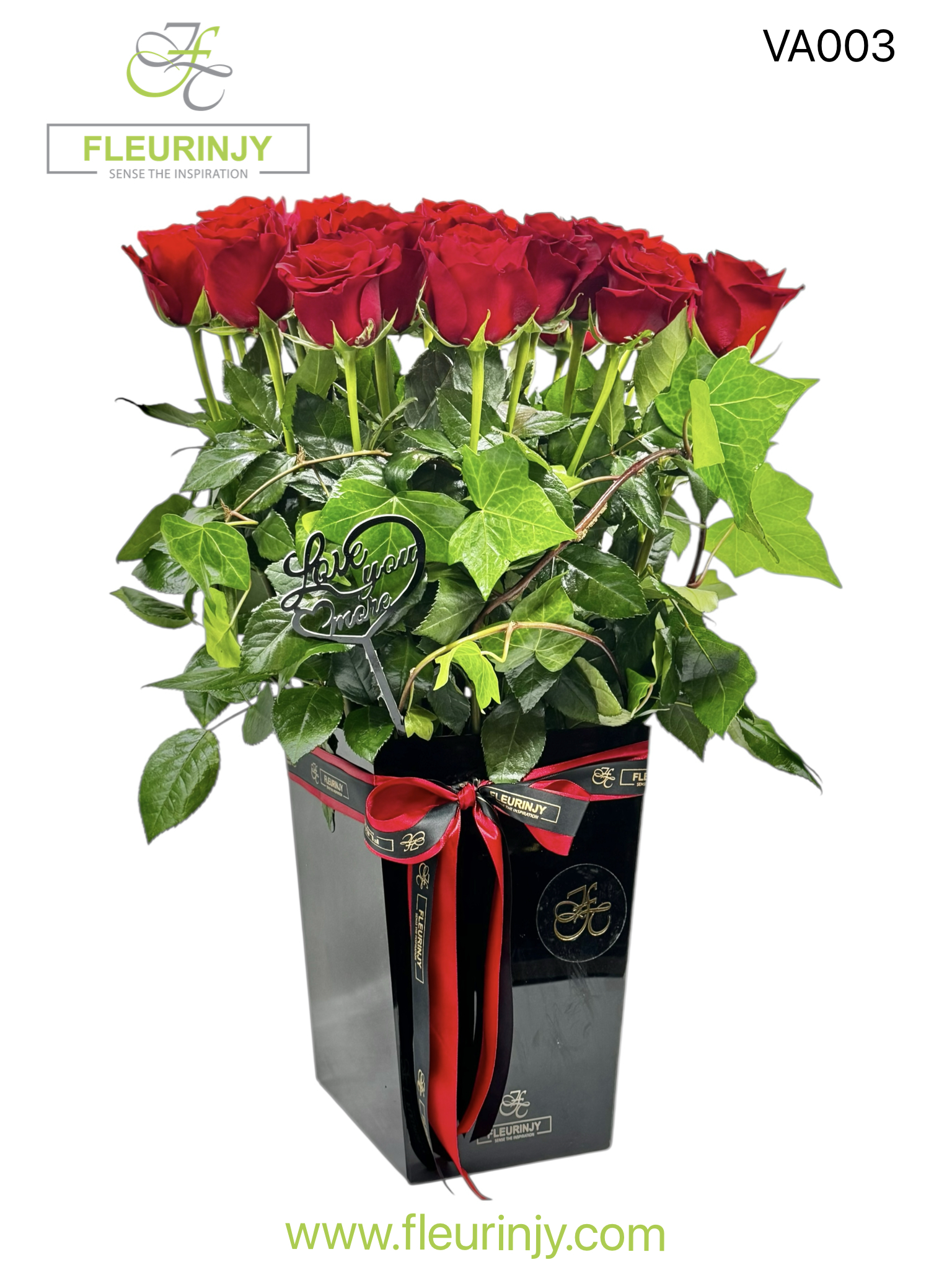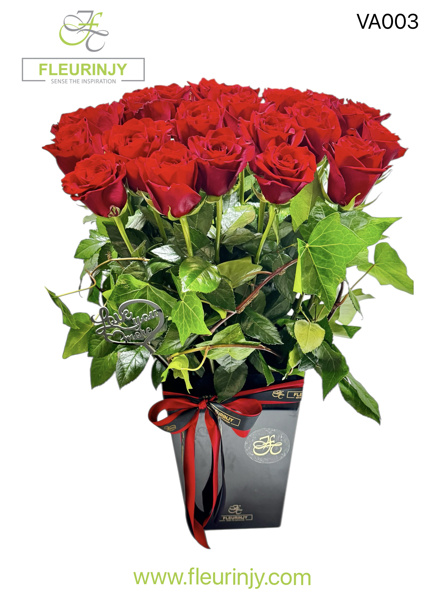 Our signature plexi base filled with 30 red roses and fresh greens. Size: 30×20.