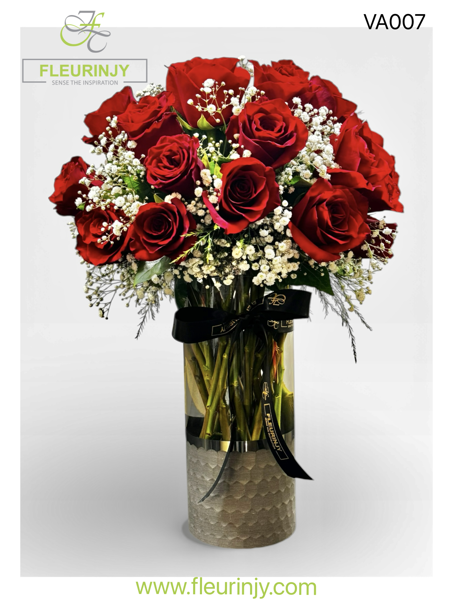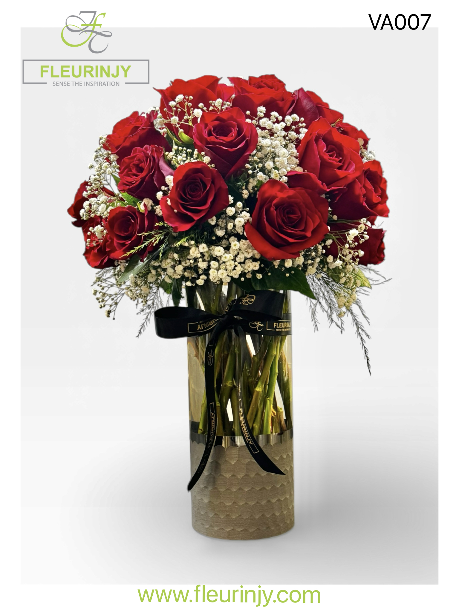 A silver and transparent cylinder vase filled with red roses, gypsophila, and fresh greens. Size: 50×30.