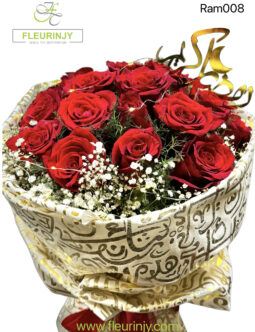 COMBO HAND BOUQUET WITH LANTERN INCLUDING 15 RED ROSES AND BABY BREATH WRAPPED IN KOUFY WRAPPING WITH 1 RAMADAN LANTERN
